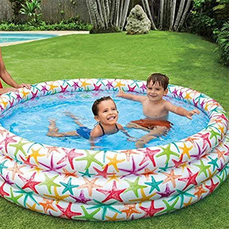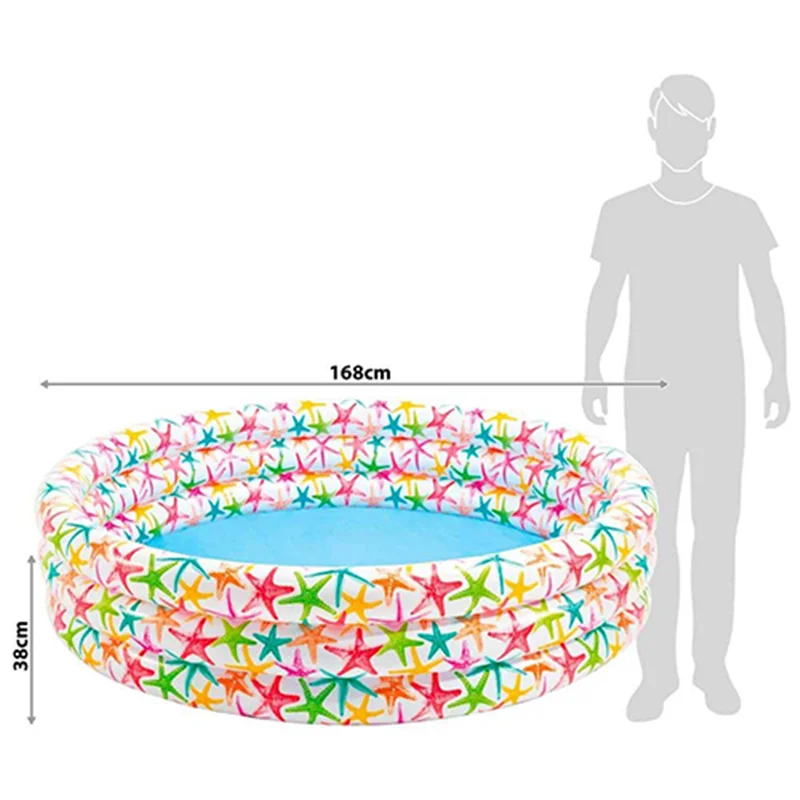 استخر های بادی گرد با طراحی های چند لایه از محبوب ترین انواع استخر های بادی کودک هستند که تنوع بسیار زیادی در طرح و رنگ دارند. در سایت پول اینتکس شاهد بالاترین تنوع این استخر های بادی هستید به طوری هر فردی به راحتی می تواند استخر بادی مورد نیاز برای کودک خود را خریداری کند. یکی از محبوب ترین و پرطرفدار ترین طرح های استخر بادی، استخر بادی کودک طرح ستاره دریایی 56440 است که با طراحی ویژه و جذاب خود توانسته فروش بالایی را از آن خود کند. بدنه این استخر بادی به رنگ سفید بوده که از ستاره های دریایی رنگارنگ با رنگ های شاد و فانتزی پوشیده شده است. این استخر بادی مخصوص کودکان طراحی شده است و با طراحی جذاب خود، هم برای دختران و هم برای پسران کاربرد دارد. دیواره این استخر بادی به صورت سه لایه می باشد که هر یک از این لایه ها به صورت یک حلقه بادی مجزا بوده و دارای دریچه باد جداگانه هستند.