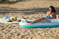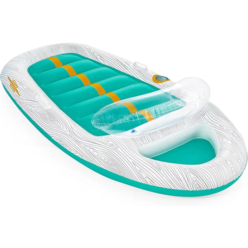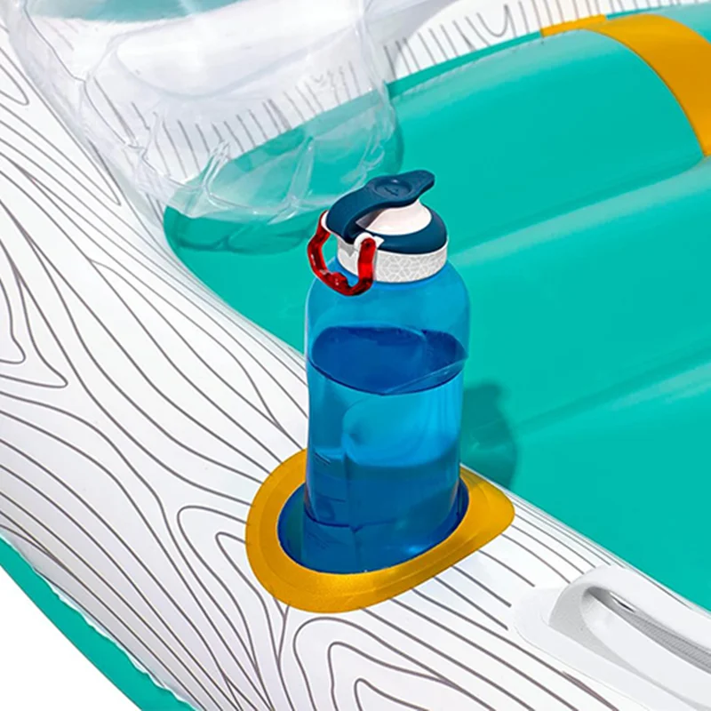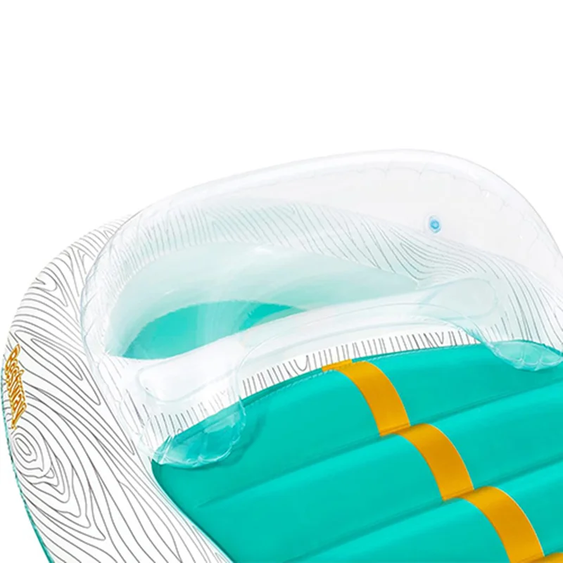 این محصول دارای یک تکیه گاه بادی می باشد که به بدنه متصل بوده و با دراز کشیدن بر روی تشک بادی، سر فرد بر روی تکیه گاه قرار می گیرد. به این ترتیب محیطی راحت برای استراحت و دراز کشیدن می باشد. سطح تشک بادی نیز به صورت مواج می باشد که مانع از تجمع آب بر سطح تشک بادی می شود. بر روی بدنه این محصول یک جالیوانی نیز تعبیه شده است که می توانید در سطح آب، نوشیدنی مورد علاقه خود را نیز به همراه داشته باشید. این محصول دارای کیفیت بسیار بالایی بوده و طول عمر زیادی دارد. تنها در استفاده از آن باید دقت داشته باشید و نکات ساده نگه داری را رعایت بفرمایید. این محصول وزن بسیار کمی دارد و دارای حجم کوچکی در حالت تخلیه است که حمل و انتقال آن را آسان تر می کند.