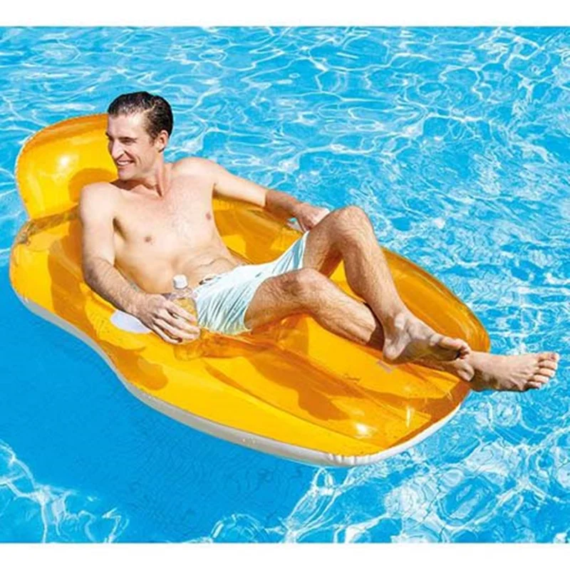 تشک بادی روی آب قایقی اینتکس 56805 یکی دیگر از بادوام ترین و در عین حال جدیدترین انواع تشک بادی روی آب استخری با طول عمر بالا و طراحی جدید و کاربردی بوده که به تازگی توسط کارخانه اینتکس تولید و روانه بازار شده است. این محصول ساختاری مستطیلی داشته که طراحی ظاهری آن کاملا مشابه به یک قایق بادی یک نفره می باشد. بخش ابتدایی این تشک بادی روی آب از یک شیب ملایم برخوردار بوده و در یک سمت نشیمنگاه اصلی آن تعداد یک عدد جالیوانی تعبیه شده تا بتوانید بر روی آب نیز بطری آب و یا نوشیدنی خود را به همراه ببرید. از سوی دیگر این محصول مجهز به دو عدد دستگیره پلاستیکی نیز بوده که با استفاده از آن می توانید تعادل خود را بر روی سطح اب به طور کامل حفظ کنید.