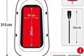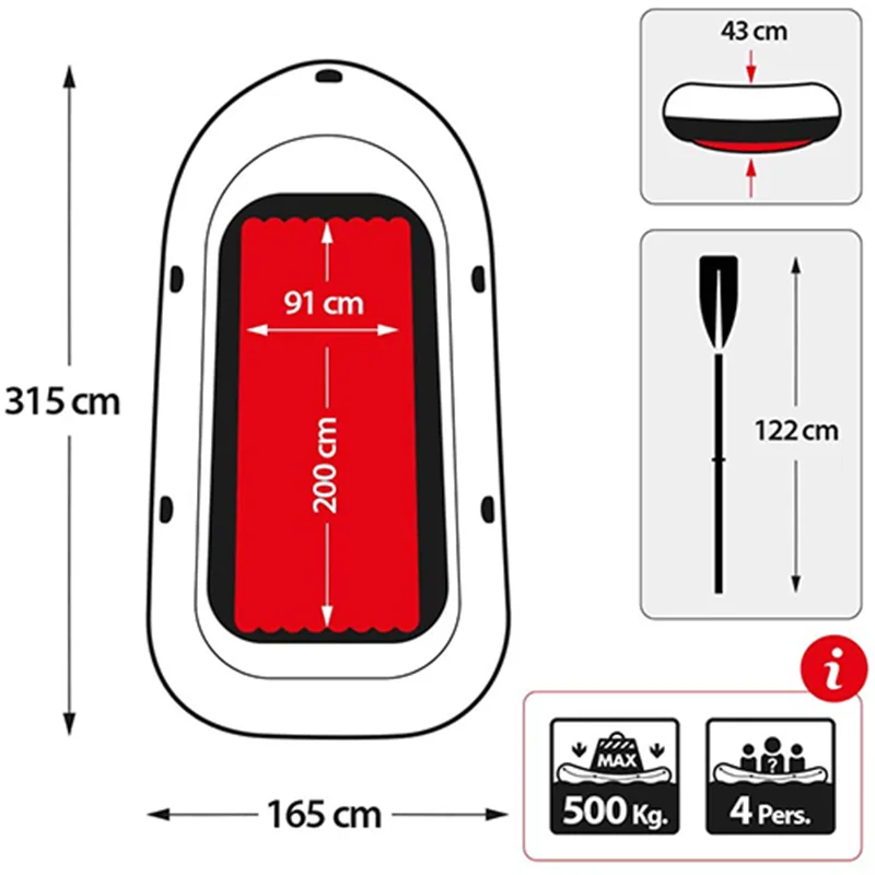 این محصول فضای مناسبی برای استفاده چهار نفر بزرگسال را در اختیار آن ها قرار می دهد و دارای دو عدد نشیمنگاه بادی به همراه تکیه گاه در دو طرف قایق بادی می باشد. وجود این نشیمنگاه ها فضای مناسبی برای نشستن افراد ایجاد می کند. محصول فوق دارای طناب نجات بوده که توسط گیره هایی در دور تا دور قایق بادی قرار دارد. دو عدد پارو نیز به همراه این محصول موجود است که استفاده از آن را راحت تر می کند. این پارو ها وزن کمی دارند و به راحتی قابل استفاه هستند. هم چنین دارای استحکام بالایی می باشند. در دو طرف این قایق بادی اهرم هایی برای قرار دادن پارو وجود دارد که چرخش پارو و استفاده از آن را راحت تر می کند. طراحی جذاب این محصول نیز یکی دیگر از نقاط قوت آن محسوب می شود. این قایق بادی دارای ضخامت بدنه بسیار بالایی است که موجب شده تا استحکام مناسب و طول عمر زیادی داشته باشد و در صورت رعایت نکات نگه داری تا سال ها قابل استفاده خواهد بود.