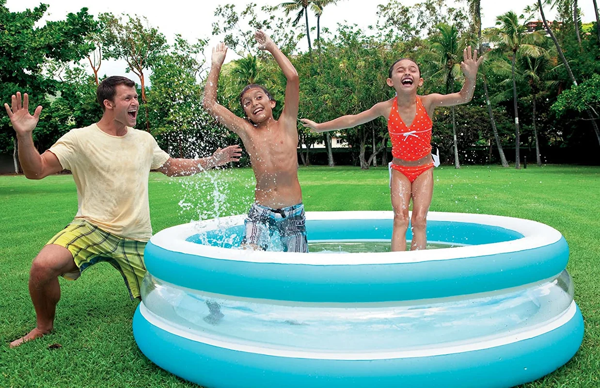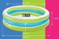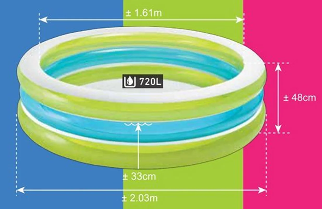 استخر بادی کودک با قطر 203 سانتی متر طراحی و تولید شده است. گنجایش آب این استخر 742 لیتر است. وزن این استخر 2.6 کیلوگرم است. بسته بندی سبک، کوچک و مناسبی دارد که حمل و جابه جایی را بسیار آسان و راحت می نماید. استخر بادی بزرگ اینتکس از ساختار سه طبقه تشکیل شده است که ارتفاعی معادل 51 سانتی متر دارا می باشد و ارتفاع هر یک از حلقه ها حدود 17 سانتی متر می باشد.